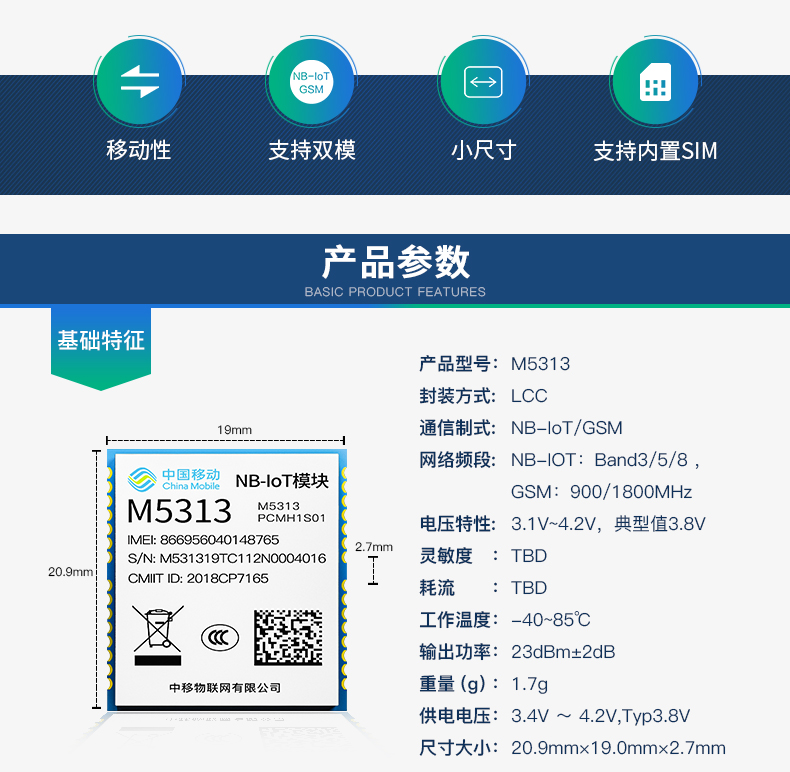 中國(guó)移動(dòng)OneMO NB-IOT/GSM物聯(lián)網(wǎng)全網(wǎng)通模塊M5313